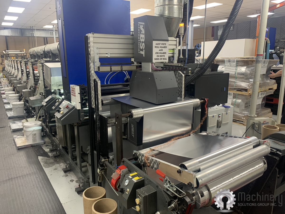 2012 Aquaflex GFLX 2800 10-unit flexo press, 28" wide with 9"–24" repeats. Designed for film, foil, labels, tags, and carton stock up to 24pt. Equipped with UV, IR, and hot-air drying, servo infeed, slitting, motorized rewind, BST vision systems, and dual corona treatment.