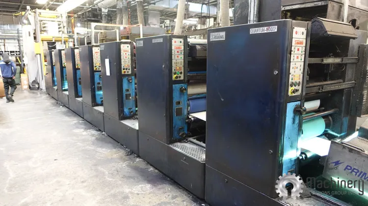 The press is equipped with seven variable size print units, each configured with both 22” and 28” inserts, allowing quick changeover between formats. Prime UV curing, advanced registration control, and comprehensive perforation options further enhance production capability. A full sheeting, stacking, and rewind configuration makes this a complete, production-ready system.