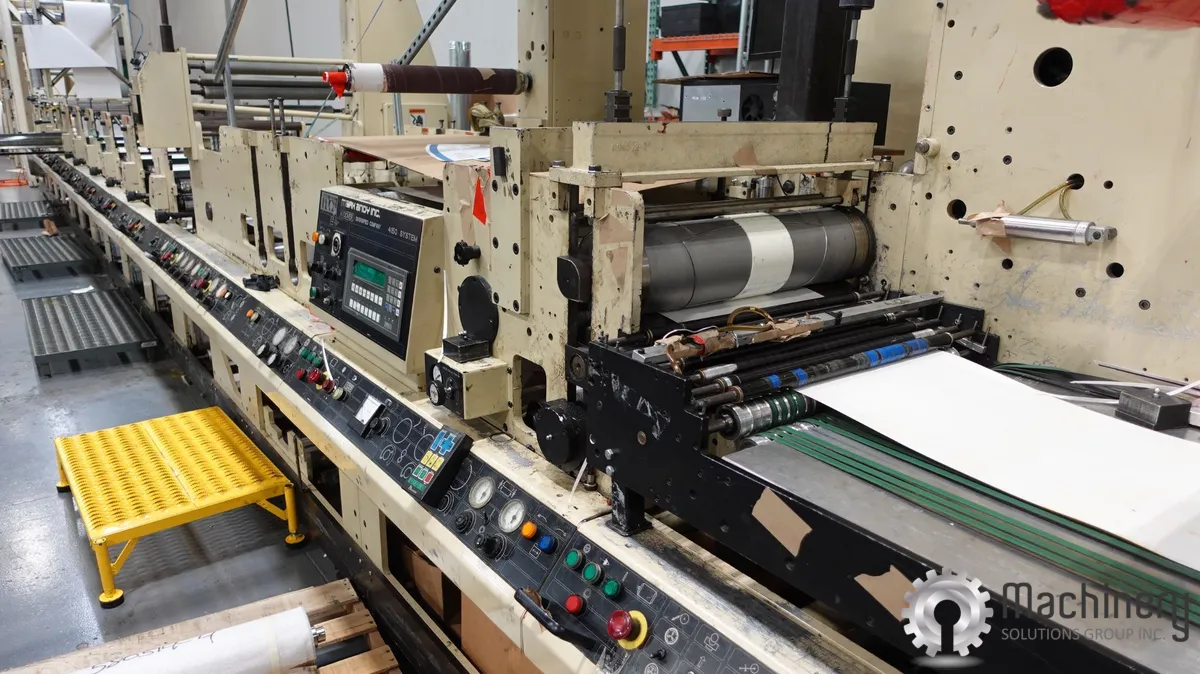 2005 Mark Andy 4150 flexographic press configured with ten print stations and designed for narrow web production applications. This press includes 360-degree register units, automatic throws, constant turn anilox rolls, and a UV curing system upgraded with SST lamps in 2025. The system is equipped with a Martin MBSXL butt splicer, laminating capability, die cutting stations, and a sheeting system, making it well suited for printing and converting applications including labels, specialty packaging, board/index stocks, and other flexible substrates.