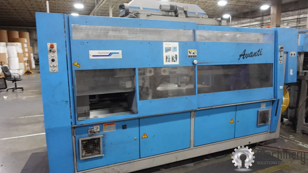 2000 Muller Martini Avanti horizontal stacker paired with a Stöcklin palletizer, designed for high-speed stacking and automated palletizing of printed products. This system is ideal for web offset and finishing lines, efficiently handling signatures, newspapers, magazines, and inserts.